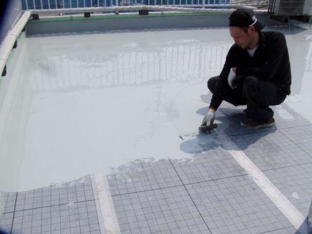 平場の不陸(凹凸)やひび割れを調整するために防水下地調整剤を塗っています。